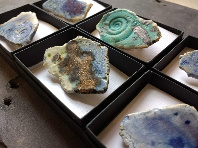 Ceramic brooches, handmade from stoneware clay, each is individually glazed with layers of matt and satin glaze, some with splashes of bronze.